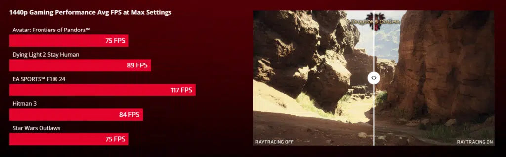 1440p Gaming | Example: 117 FPS in F1 24, 89 FPS in Dying Light 2 Stay Human at max settings. |